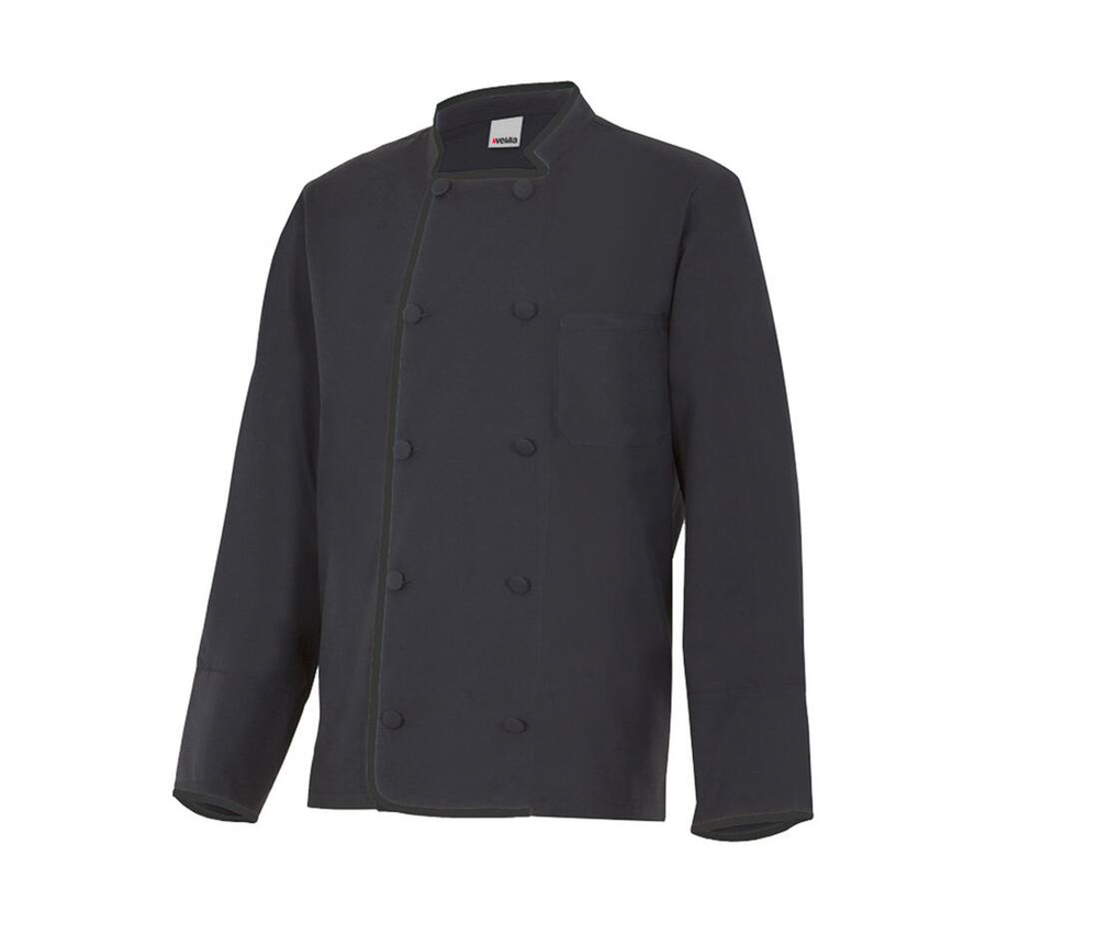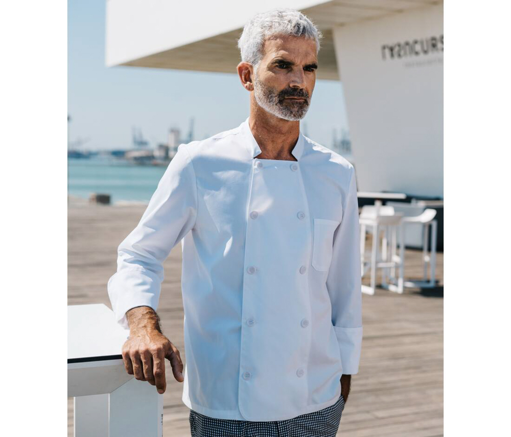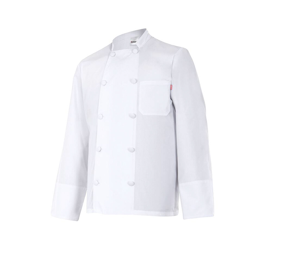 Fermeture double boutonnage Col officier. Manches longues avec ouvertures aux poignets. Sans couture latérale. Bouton de rechange. Poche poitrine. 65% polyester/35% coton.