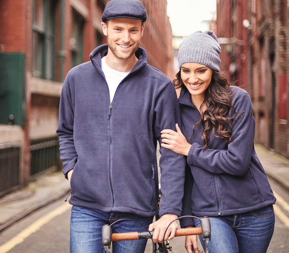 Veste polaire 320. Anti-peluche. Matière molletonnée compacte pour plus de chaleur. Surface plus lisse pour faciliter la décoration. Coupe ajustée. 2 poches latérales zippées. 100% polyester.