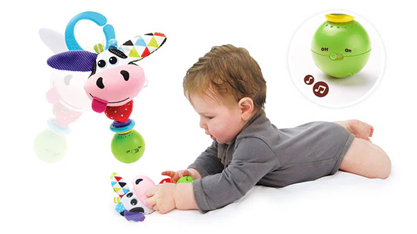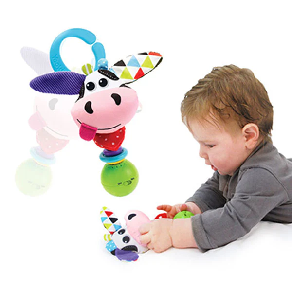 De leuke en kleurrijke rammelaar Shake Me Rattle Koe of hond is van het merk Yookidoo. De muzikale rammelaar is speciaal gemaakt voor kleine handen en is dus gemakkelijk vast te pakken door je kindje. De koe of hond hebben verschillende texturen en knisperende deeltjes. Het geluid is gemakkelijk aan/uit te zetten door middel van een knop.