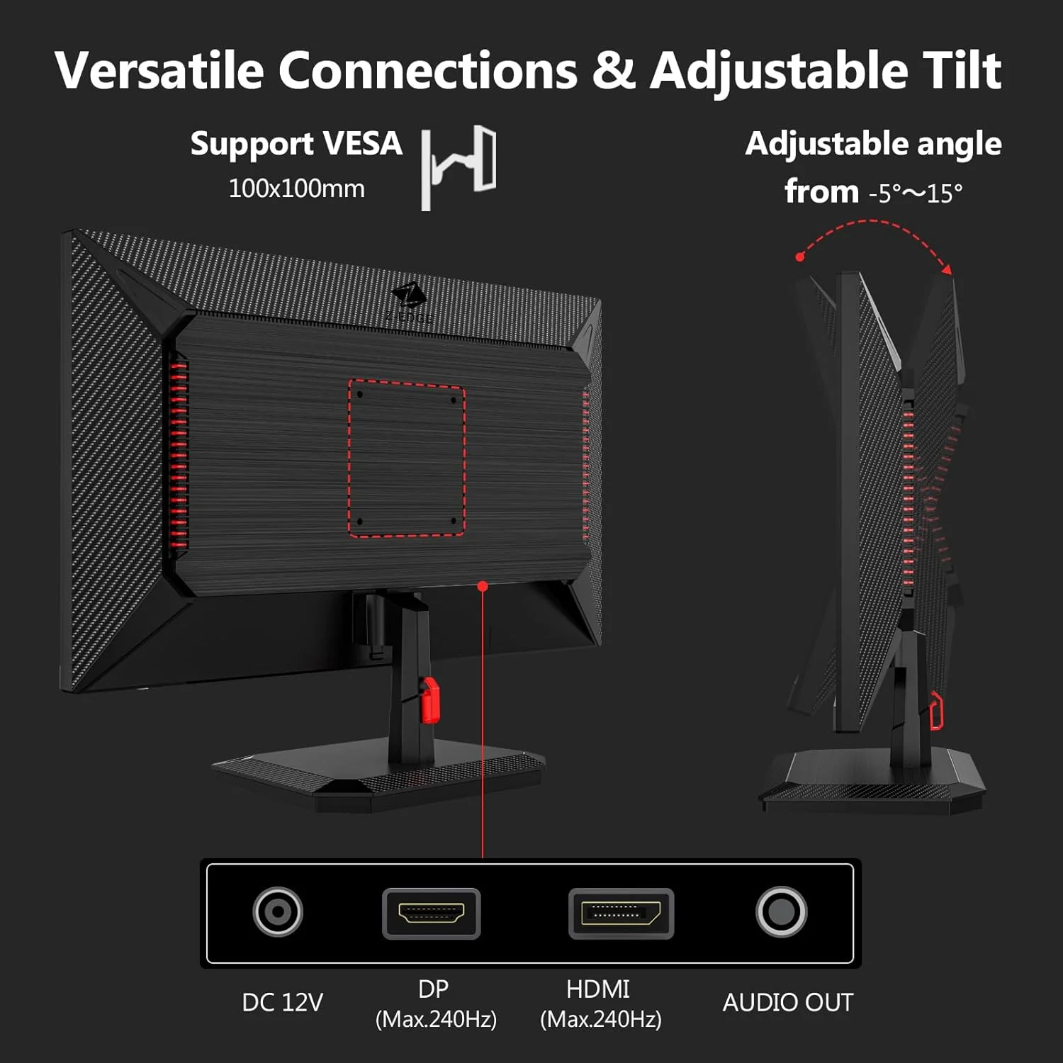 - Connectivité Dual HDMI 2.0 + DP 1.4 : Ports HDMI 2.0 et DisplayPort 1.4 pour connecter simultanément PS5, Xbox et PC. Inclinaison réglable (-5°~15°) et compatibilité VESA 100x100mm, offre une installation flexible sur mur ou bras articulé, s’adaptant à toutes les configurations de travail ou de divertissement